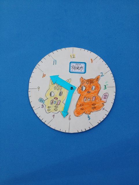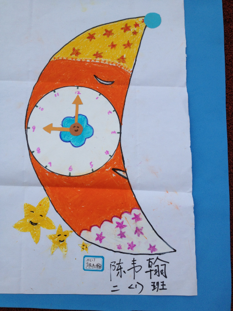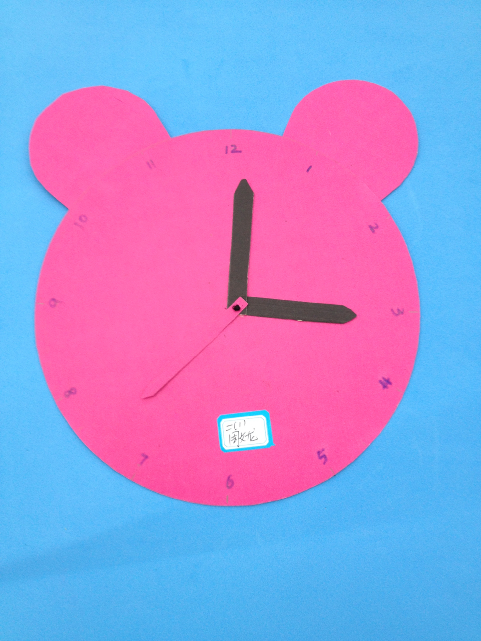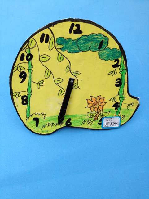 有的孩子“变废为宝”,将自己心中的钟面描绘在胶扇上,硬纸盒上;有的孩子精心选材,在美丽的卡纸上勾画出心中的所爱,既有俏皮的kity猫,可爱的小兔;又有金灿灿的向日葵花、弯弯的月亮……