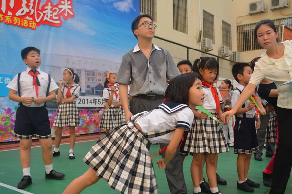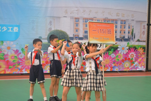 活动中,同学们用激情和活力展示了他们的风采。放飞理想——纸飞机掷远比赛前,22个班级代表队手持纸飞机,进行班级风采展示。参赛队员踏着自信的步伐,不同的position,不同的创意,其中一(8)班的“超人”组合, 造型别具特色,赢得观众阵阵掌声。随后纸飞机掷远比赛正式开始。参赛队员一字排开,卯足了劲,“嗖”的一声,一架架纸飞机凌空飞翔,五(1)班黄绍峰同学,以独特的平衡艺术,以20米掷远成绩,刷新本项活动纪录,勇夺冠军。