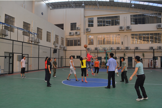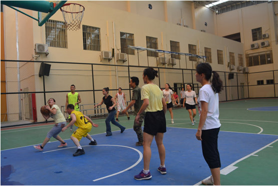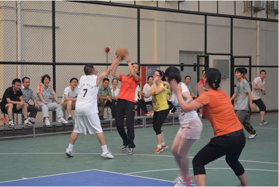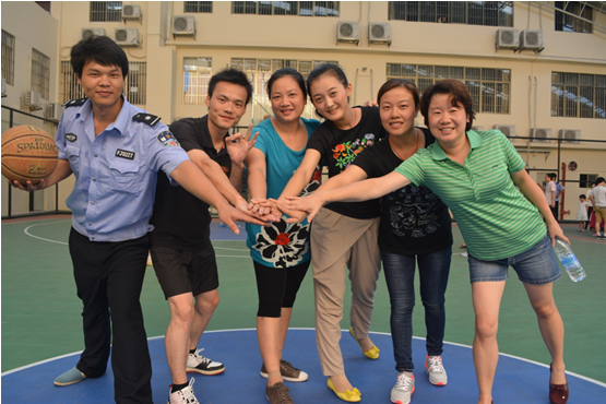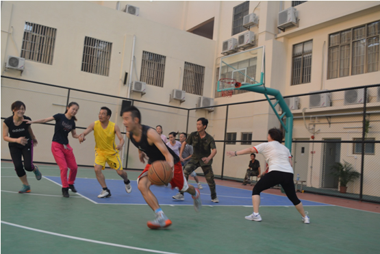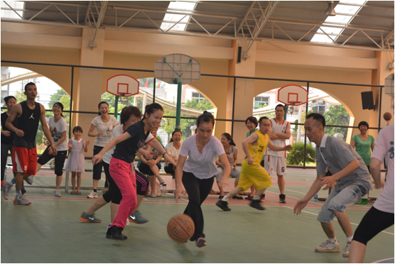 7月6日下午4:30,广州市花都区黄广小学行政后勤组与语文教师组展开的男女混合篮球赛激烈进行,拉开假前教职工趣味篮球赛活动的序幕。