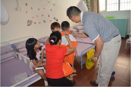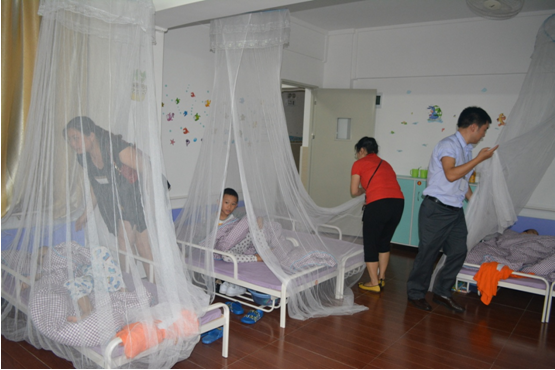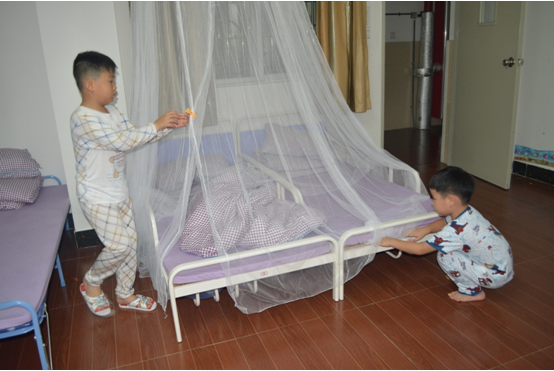 晚上8:00,全体教师深入学生宿舍,配合生活教师进行生活自理能力训练,教会学生挂蚊帐、洗漱等。