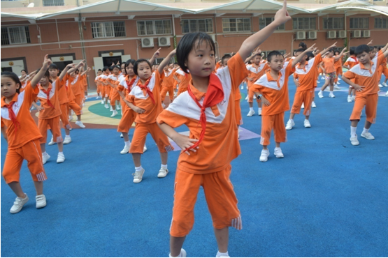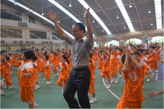 在神曲《小苹果》的节奏下,全场师生挥舞手臂,欢乐开唱,全校呈现出一片舞动的海洋,成为黄广实验小学一道别具一格的靓丽风景。