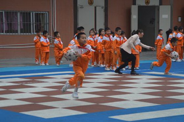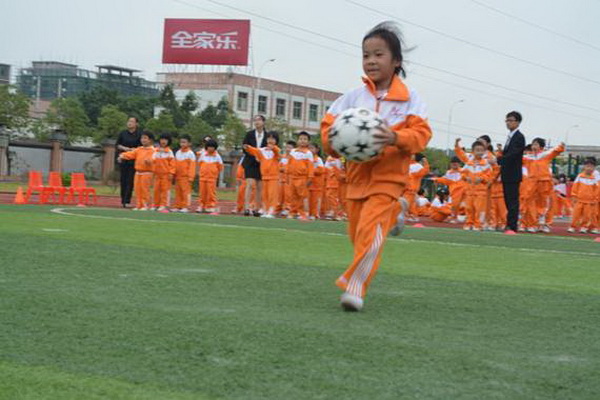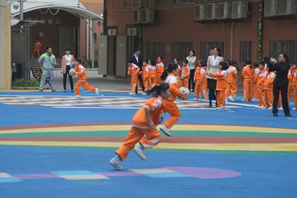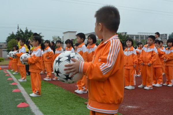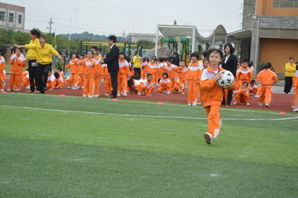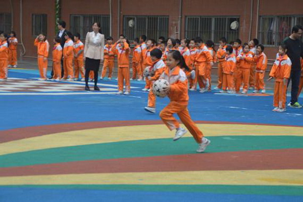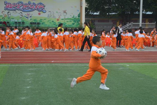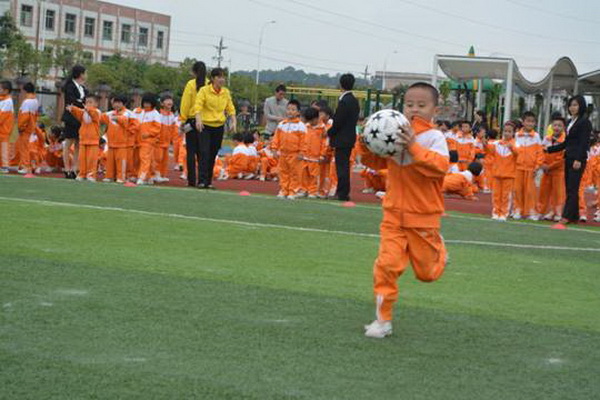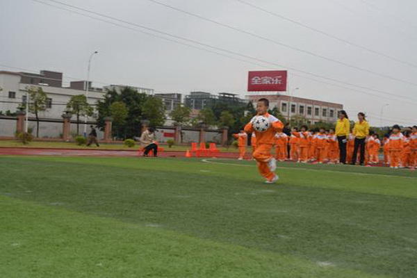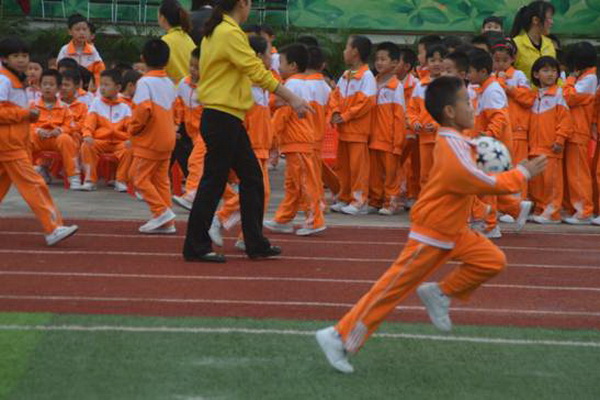 抱球接力比赛,听到裁判哨声,抱球向前奔跑,绕过障碍物返回,将球传给下一位同学。奔跑过程,球不得落地。一、二年级设此项目。