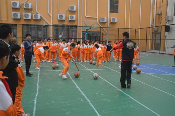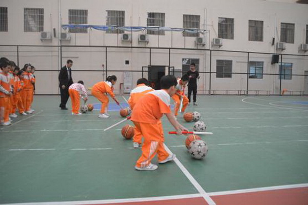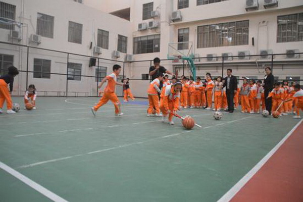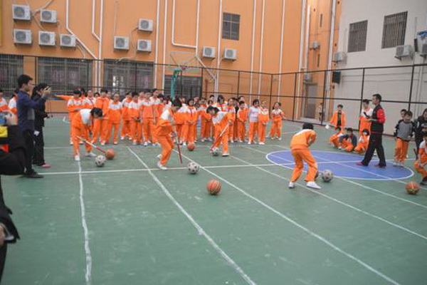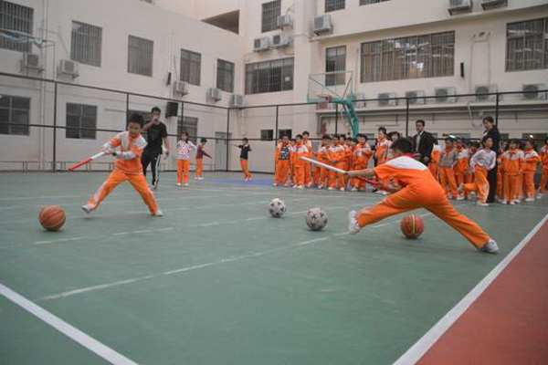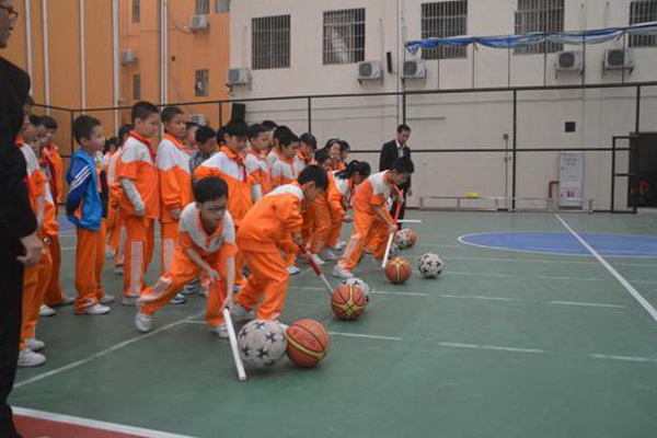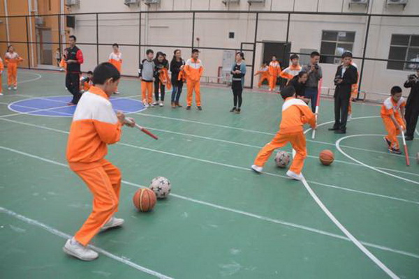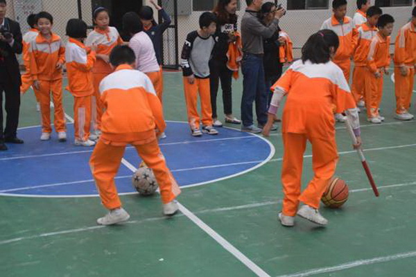 赶“猪”跑项目,参赛队员用体操棍拨大小两球,将“猪”(篮球和排球)赶向对面队友,赛道长20米。中、高年级设此项目。