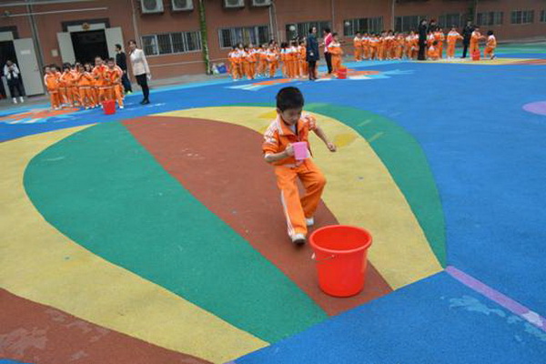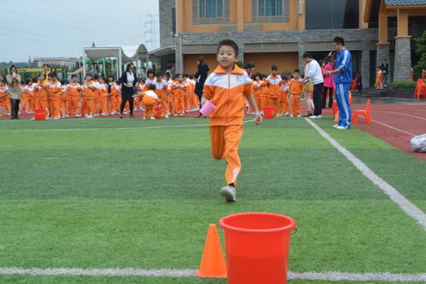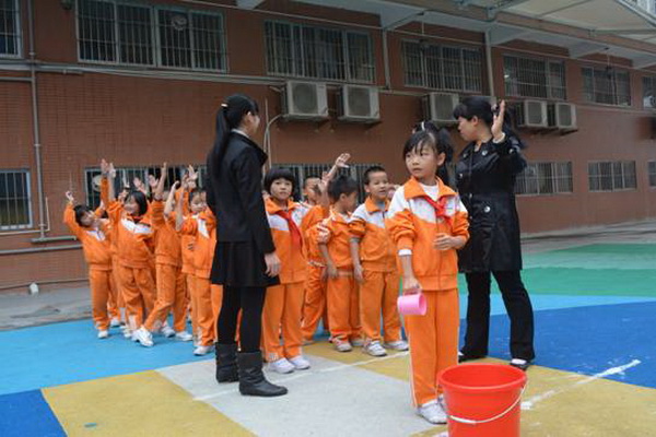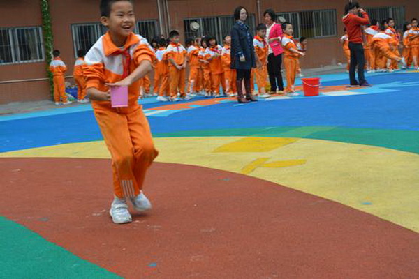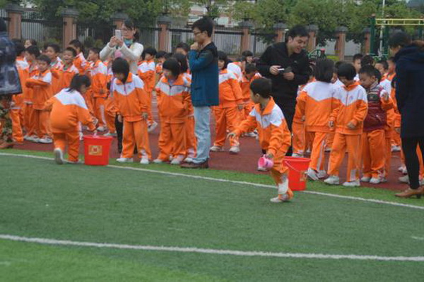 争分夺秒项目: 参赛队员排一路纵队站起跑线外,裁判哨响,手拿空杯迅速起跑,在前方水桶盛满水后,绕过障碍物,原路返回,将杯中水倒入指定桶内。4分钟内,以指定桶内盛水量多取胜。一、二年级设此项目。