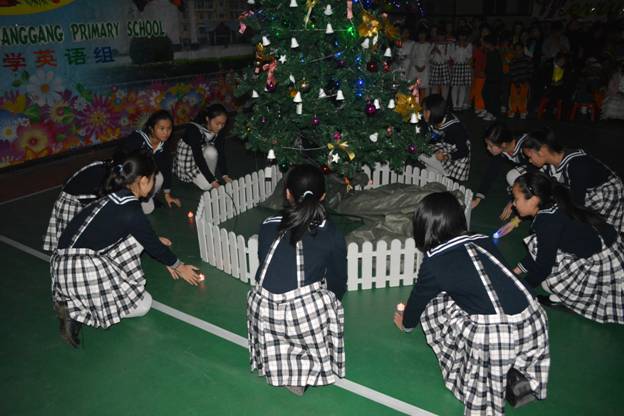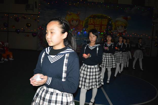 瞬间,灯光熄灭,孩子们屏气凝神。身着礼服、手捧烛光的12个孩子,伴着深情的音乐,从舞台两侧款款走来,随着队形的变幻,伴着音乐的节奏,孩子将手中的烛光时而捧在手心,时而擎过头顶,绕着圣诞树围成一圈,双手合十,闭上眼睛,许下新的一年美好的愿望。