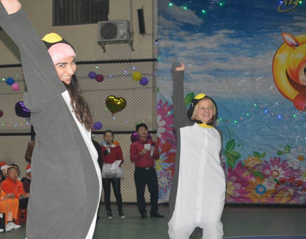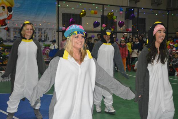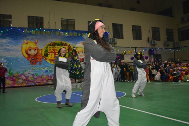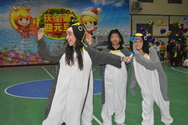 首先热场的当属我们的外教Rita、Olga、Karina、Aretha 。她们身着活泼可爱的企鹅服饰,扭捏的姿态、纯正的口语以及动感欢快的舞蹈表演——《Po pow pay》震撼了全场。