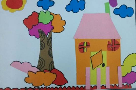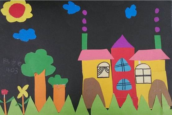 五(1)班的周海英细心又有恒心,她创作了一幅幅精美的手工剪贴画,《乡村的房子》是她最得意的作品,颜色搭配相当美观;