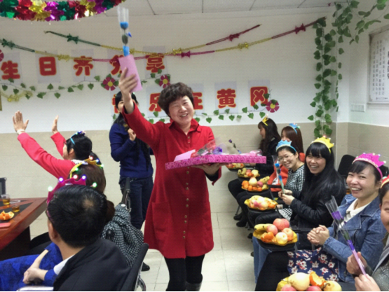 随后,学校领导们向大家送生日贺卡和鲜花、蛋糕,送给大家一份浓浓的情意、深深的祝福。精彩纷呈的节目陆续登场,教职工们开始了载歌载舞。
