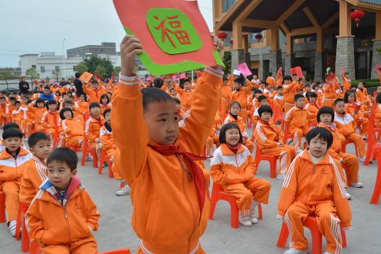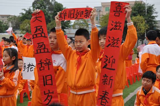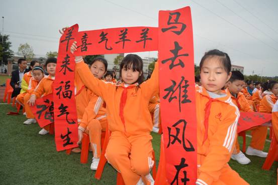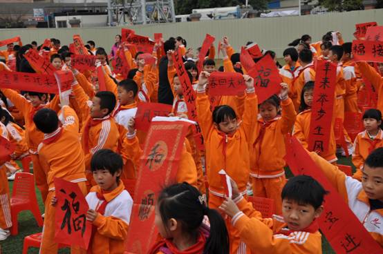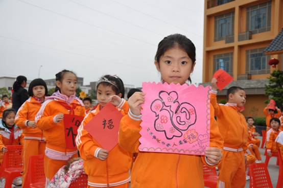 随后学生现场展示了学校假前布置的“春节实践探究作业”,校园中,人群里“福”、“春”、“对联”满校园。潇洒的书写不失稚气,灵动的创意不失匠心。一(20)班邓子奕同学设计了一个镂空的“福”字,尤其是“福”字周边的一句“对父母尽孝的人最有福”意味深长。