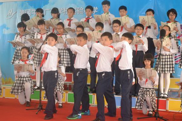 这是4月18日黄广小学第二届校园艺术节班级美文朗诵决赛现场一幕。