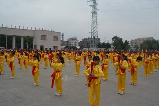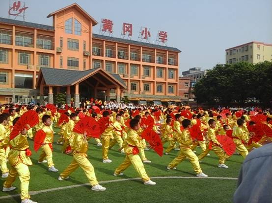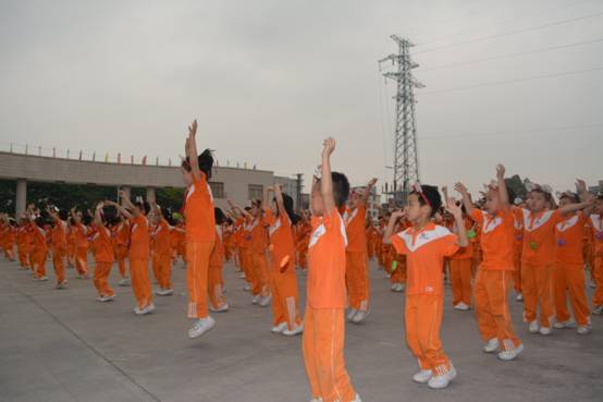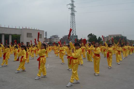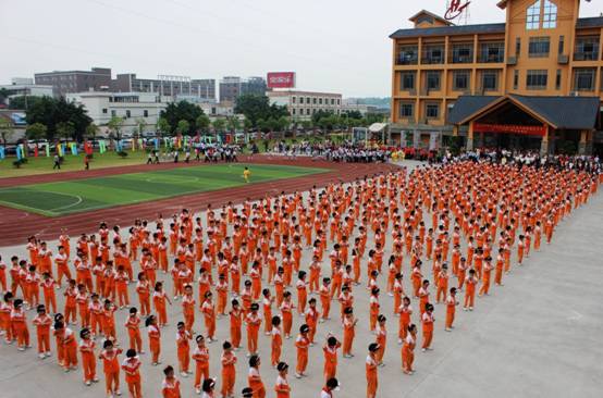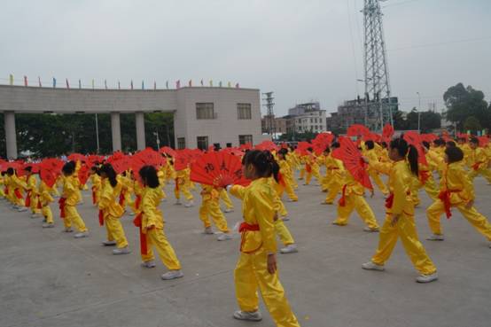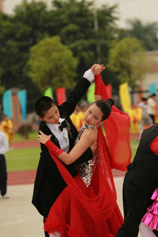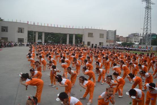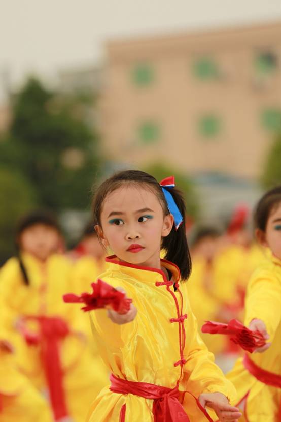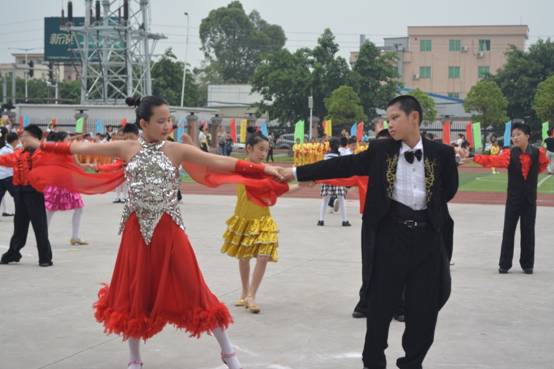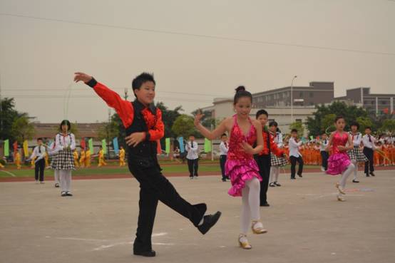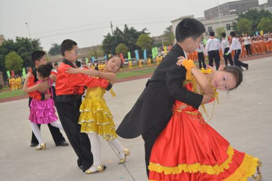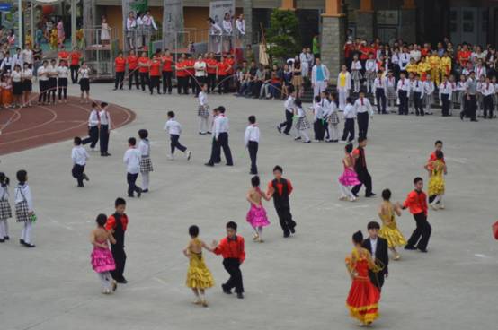 随后,操场中央同时出现花样跳绳、戏剧花脸、武术套拳、国标舞蹈等串场表演,场上一排欢腾嬉戏。