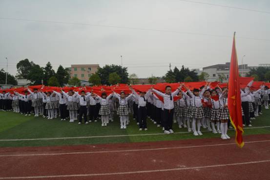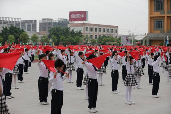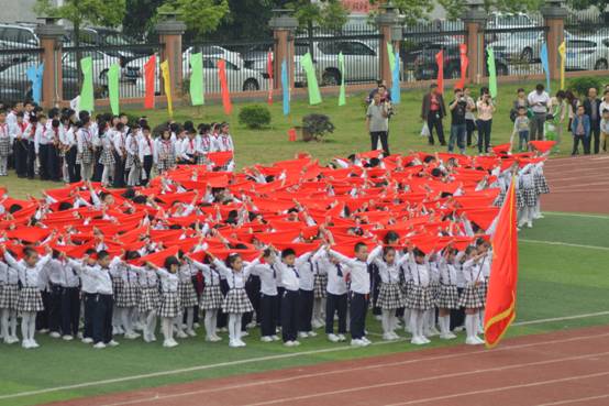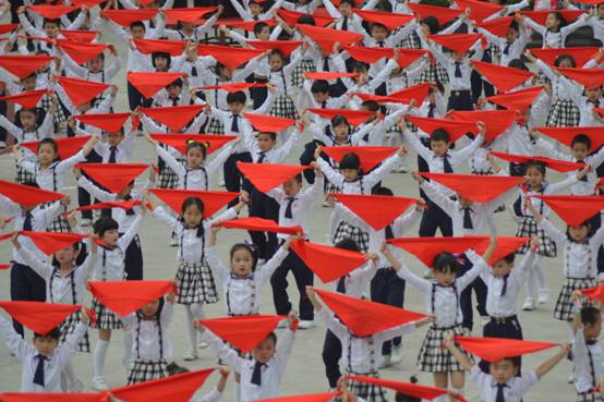 在《红领巾飘起来》坚定激昂的歌声中,二年级学生手捧鲜艳的红领巾,从三个不同方向汇集操场中央,伴随歌声飞扬,红领巾有节奏飞舞,形成一片波澜壮阔的红色海洋,让人心潮澎湃。