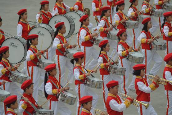 鼓号铿锵,二年级学生退出舞台,在后方汇集成一个偌大的红领巾形状的方阵,鼓号队迈步而上。