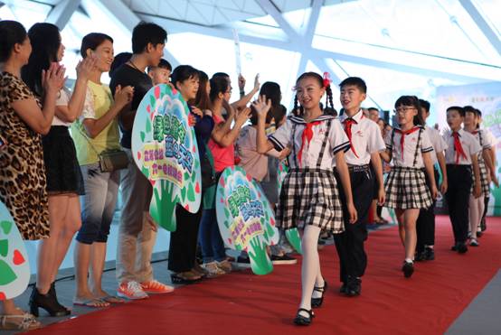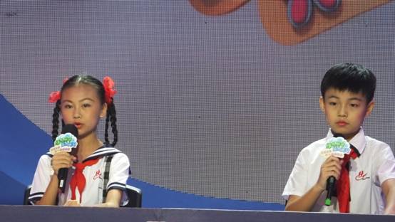现场举行了盛大的秀红地毯活动,黄广小学学生甫一亮相便轰动全场,孩子们以饱满的精神,昂首阔步走过红地毯,并一路微笑与观众互动挥手致意。王晰同学刚走出红地毯,便被现场节目主持人堵住,递上话筒,接受采访。王晰同学从容应对,落落大方、彬彬有礼,赢得主持人第一个赞。