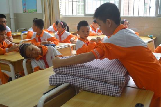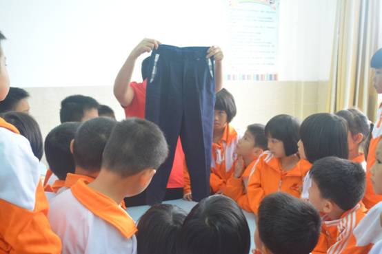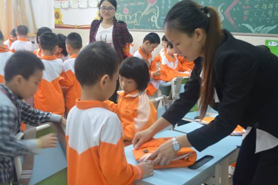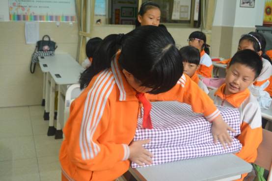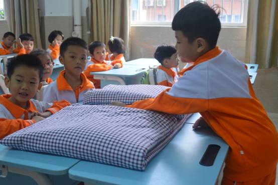 生活老师把被子、衣服带到课堂上,手把手教孩子们叠被子和衣服。