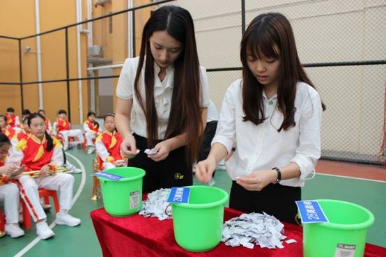 活动现场,27名候选人依次进行海报展示、拉票演讲。随后,来自各二至六年级各中队队员代表本着实事求是、客观公正、择优竞争的原则,为他们投上了信任与鼓励的一票。最终在27名候选人中14位同学凭借良好的素质脱颖而出,成功当选为新一届大队委员。