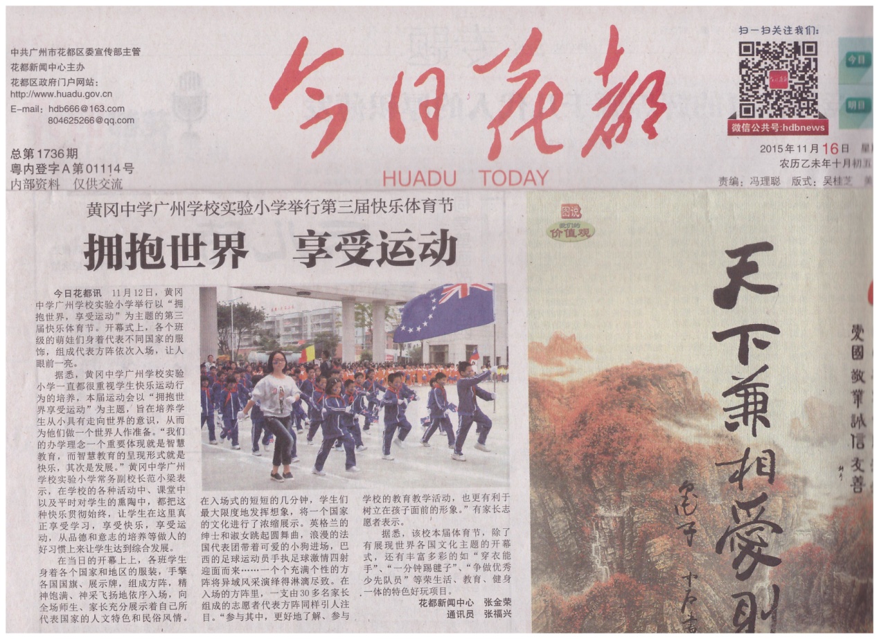 据悉,广州市花都区黄广小学一直都很重视学生快乐运动行为的培养,本届运动会以“拥抱世界,享受运动”为主题,旨在培养学生从小具有走向世界的意识,从而为他们做一个世界人作准备。“我们的办学理念一个重要体现就是智慧教育,而智慧教育的呈现形式就是快乐,其次是发展。”广州市花都区黄广小学常务副校长范小梁表示,在学校的各种活动中、课堂中以及平时对学生的熏陶中,都把这种快乐贯彻始终,让学生在这里真正享受学习,享受快乐,享受运动,从品德和意志的培养等做人的好习惯上来让学生达到综合发展。