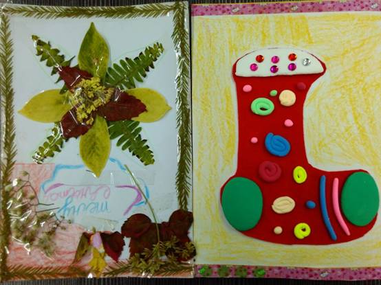 本次圣诞贺卡设计大赛活动中,孩子们设计的圣诞贺卡色彩鲜艳,使用了各色卡纸,贺卡上的图案取材各有特色,或用蝴蝶标本,或用剪纸,或用水彩笔描绘,或用橡皮泥等材料做成了圣诞袜、小礼盒、圣诞老人等有关圣诞节元素的图案。