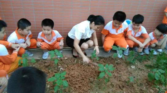 7月1日,广州市花都区黄广小学科学教师张琼霞和孩子们一起,现场评价各班劳动实践基地种植养护成果,分享一学期来播种、收获的喜悦。