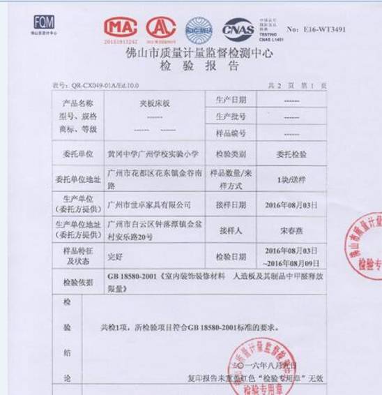 佛山市质量计量监督检测中心检验报告显示:师生使用的床板等经检测符合GB18580—2001标准的要求,检测合格。