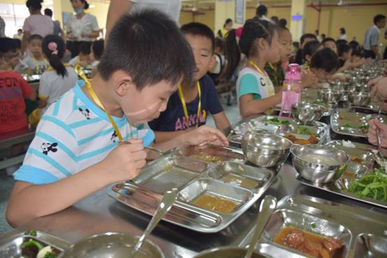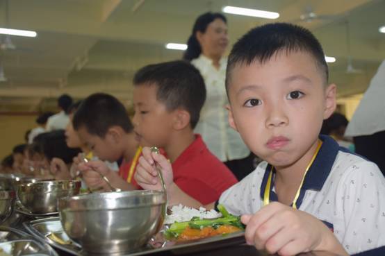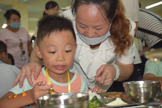 黄莉副校长和老师一起,细心关注每一个孩子用餐情况。
