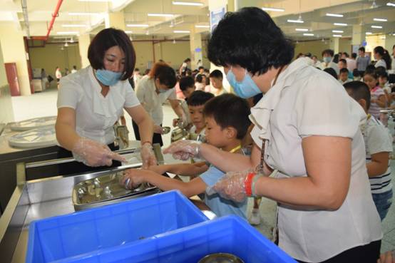 孩子们用餐,老师、生活老师、食堂工作人员齐心协力,共同帮助。