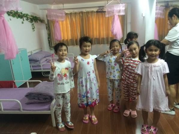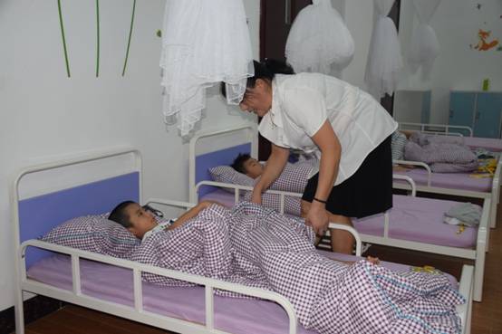 午休时间,生活老师细心地为每个孩子盖好被子。