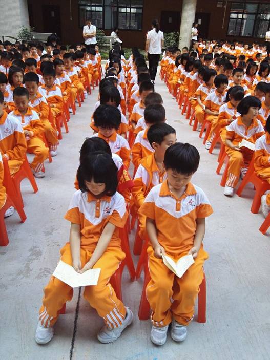 紧接着,德育处谭英主任在队旗下给预备队员介绍“少先队员”这个神圣的称谓。孩子们用心地学习了有关队的知识、敬队礼、宣誓时的手势,以及如何争章入队。孩子们坐姿端正,侧耳倾听,专著的眼神表达了孩子们争章入队的决心。