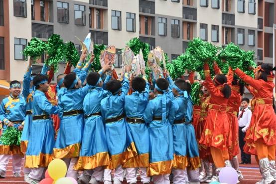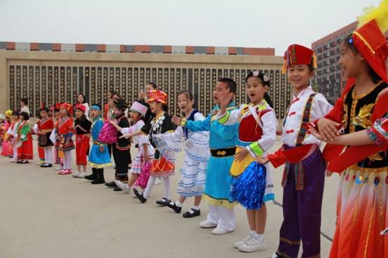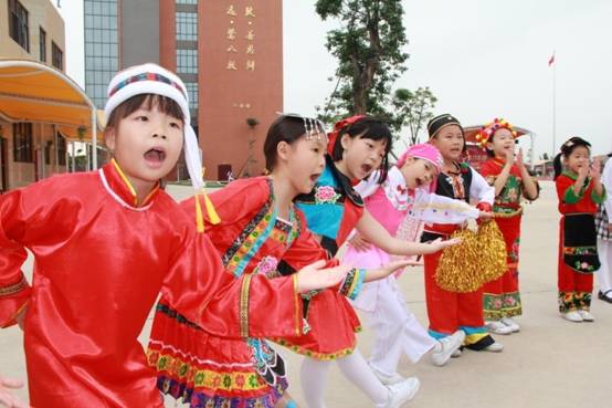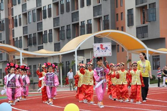 各班级入场式中,每个班级身穿一种民族服饰,并配以道具,充分演绎该民族风土人情、文化特色:傣族的六(3)班孩子们现场表演起泼水节,将现场气氛推向高潮;满族的二(4)班格格、阿哥雍容华丽、风度翩翩;畲族的二(7)班孩子们跳起筷子舞,来庆祝五谷丰登……