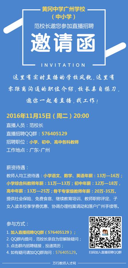 11月15日,黄广教育集团与全国专业教师招聘网——万行网合作,开启映客直播进行教师招聘咨询,范小星校长与全国各地教师近万人面对面互动交流。