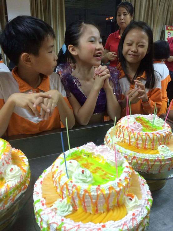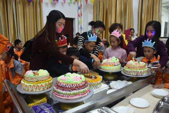 生日会接近尾声时,现场响起了大家最熟悉的生日歌,孩子们围在生日蛋糕的周围,一起许下生日愿望……