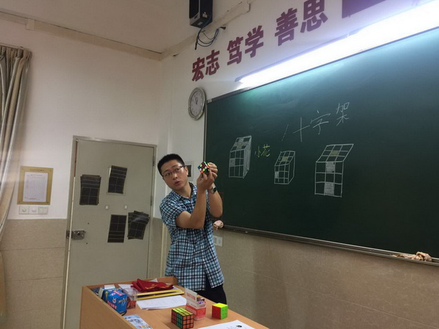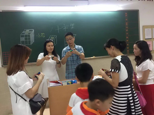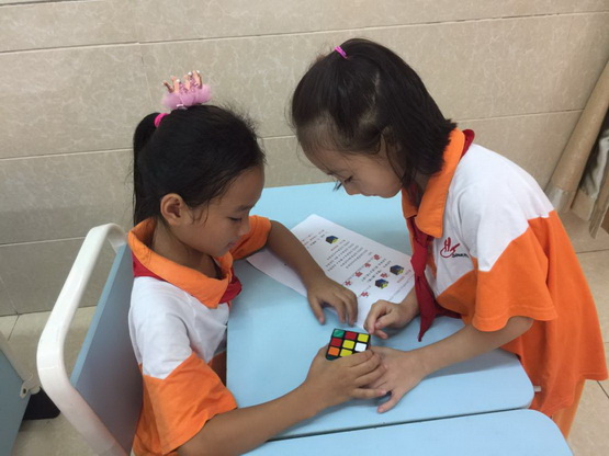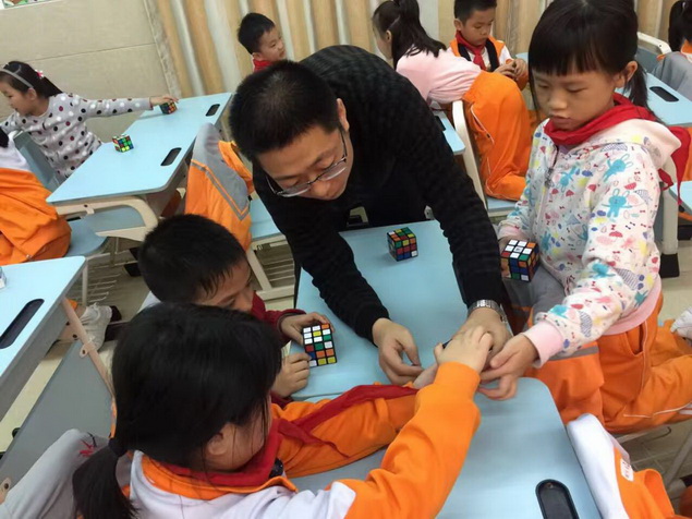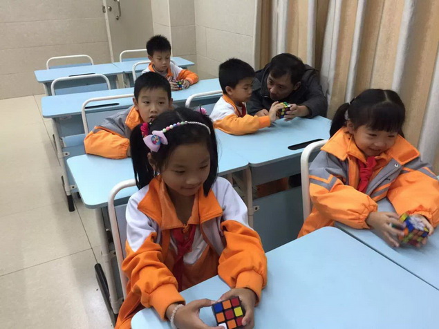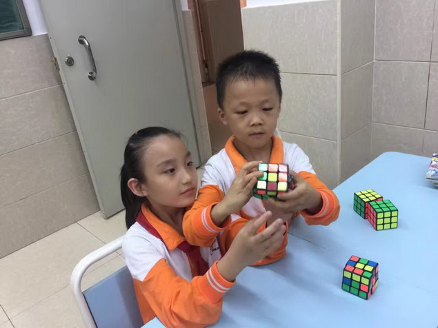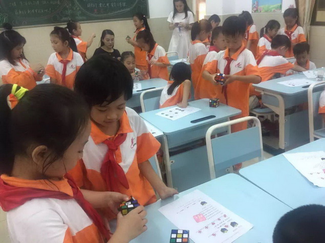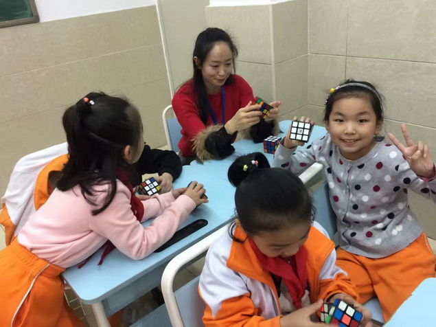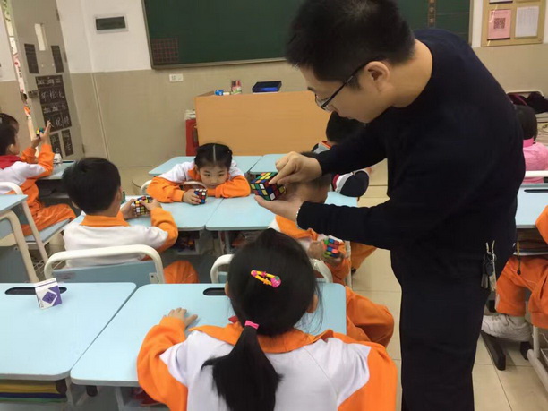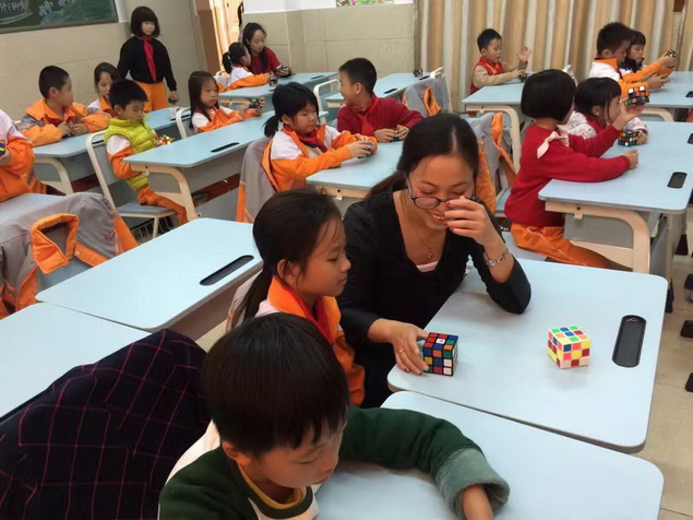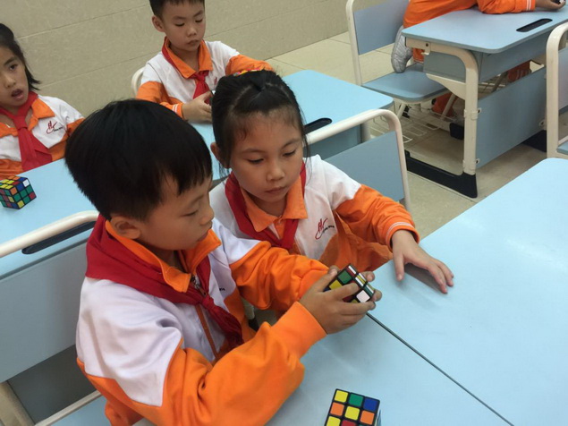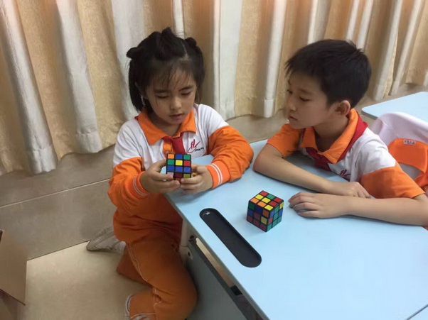 经过几周的学习,孩子们逐步熟练了魔方还原的基本手法,开始了下一步的学习——做“小花”。