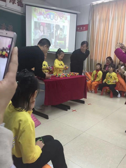 艺霖爸爸苦心钻研,实施兴趣教学法。先让孩子们欣赏二(8)班两位魔方高手艺霖、俊一两个孩子10分钟魔方还原现场表演,让孩子们在惊叹之余,激发孩子的学习兴趣。
