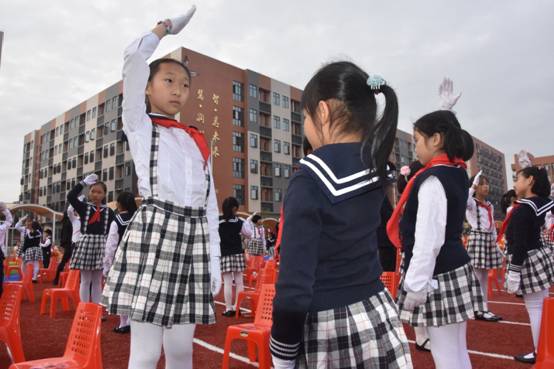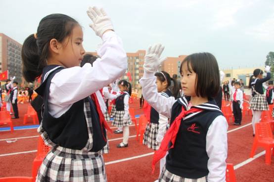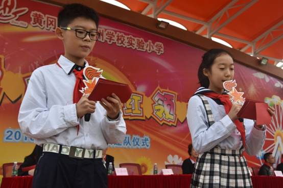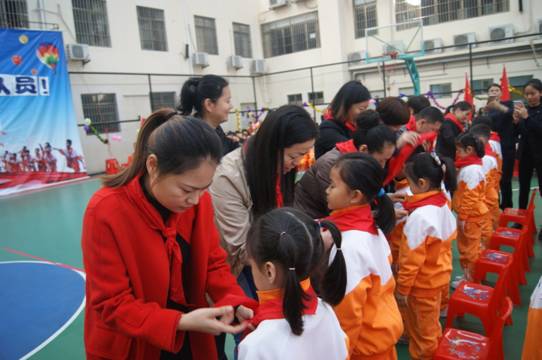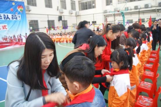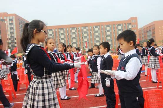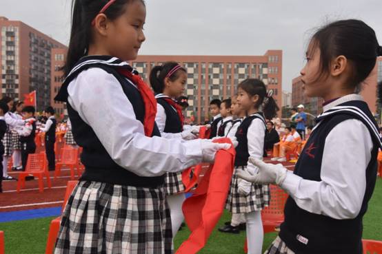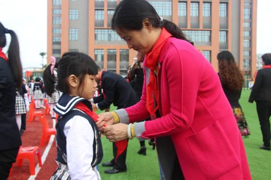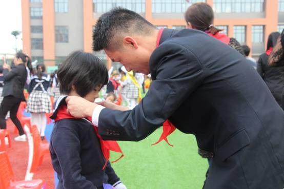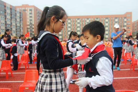 由嘉宾领导代表和高年级大哥哥、大姐姐为一年级新队员戴上了鲜艳的红领巾。当鲜艳的红领巾佩带在他们的胸前时,孩子们的脸上都洋溢着激动与自豪。