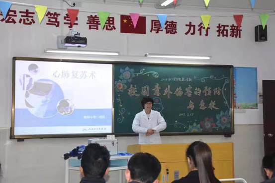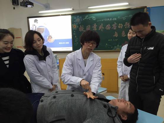 我校校医结合曾在大型医院120急救中心任职的丰富实践经验,重点指导了心肺复苏术核心要领,还精炼的提出了“CAB”的口诀,并现场进行实践操作演练。