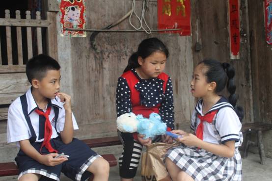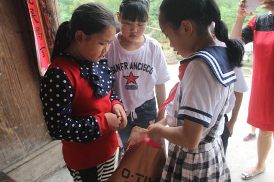 黄广小学爱心代表队4组家庭带上孩子们精心准备的4套礼物,分别送给了这4个留守的孩子,她们还互