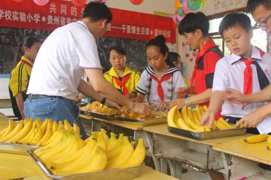 从广州到贵阳地高铁5小时30分,再经过2小时汽车的颠簸,终于到达了瓮安县城。黄广小学爱心代表队一到达瓮安县城,顾不上满身地疲惫,就立即展开了生日会的筹备工作,大家分工负责:买水果组、买食品组、订蛋糕组,每一组都忙的不亦乐乎……