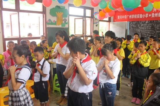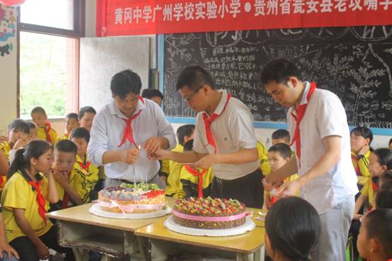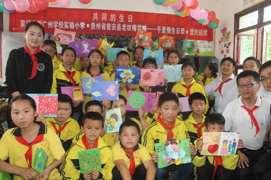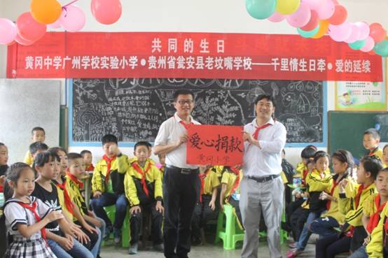 6月21日,广州市花都区黄广小学刘琅忠主任带领家长、学生代表一行,组成黄广小学爱心代表队,满载着全体师生、家长的爱心善款,再次回访贵州省瓮安县老坟嘴学校,与该校师生举行集体生日会,回访部分贫困学生。