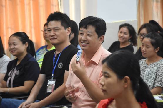 积极教育讲师、广州市骨干教师、广州市教育局特约教研员、二级心理咨询师黄永平校长以“和善而坚定,做有生命温度的教育”为主题,通过有趣的游戏创设体验的情境,通过“挑战&期待”、“启发&命令”、“鼓励&表扬”三种不同的案例,深入浅出地让老师认识和理解了“积极教育”的深刻含义。