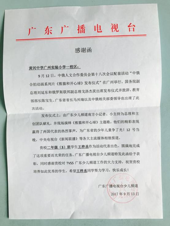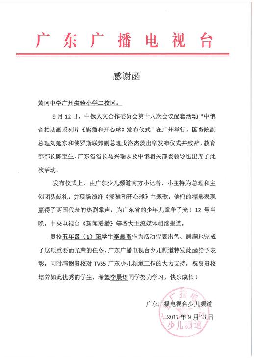 日前,广东省广播电视台向广州市花都区黄广小学发来感谢信。