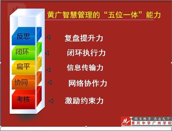 黄广中学广州(简称“黄广”)教育集团CEO游烈峰以“升级黄广智慧管理优势,铸就黄广二次创业辉煌”为题,向全体与会管理干部作专题报告,要求全体管理干部建立以“反思”为核心的复盘提升能力、以“闭环”为抓手的团队执行能力、以“扁平化沟通”为渠道的信息传输能力、以“网络协同”为目标的网络协作能力、以“考核”为导向的激励约束力,构建黄广“智慧”管理团队的“五位一体”能力。