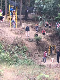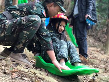 好几个训练项目说句实在话,家长上去家长都怕。——例如到大树顶部约莫有三层楼高的绳梯,徒手攀爬。例如30米宽的河床,滑索穿越。例如,土坡滑板,基本上是飞速直冲下来,要靠两个大人,用人手阻拦才刹得停。——特别是有恐高症的爸爸,在昆明玩攀岩,在顶上不敢动,还要两个宝贝喊加油。是害怕。