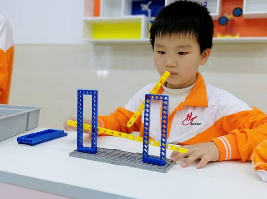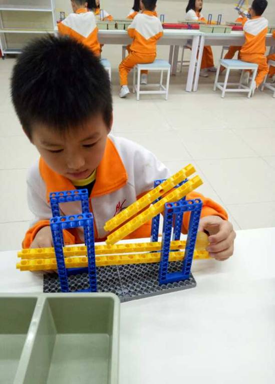 目前,一年级的孩子从学习《玩趣方块》到《力与简单机械》,以积木为主轴,掌握了斜面原理的特点,并知道斜面原理在生活中的应用,还能结合相应的器材搭建出双层斜面模——滑滑梯。