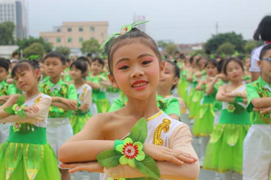 一曲简单明快的《我和黄广一起长大》主题曲拉开序幕,一小时后又再次响彻校园,一起一收,一呼一应,一唱一吟,不仅唱出孩子们“生如夏花”的梦想,更让大型团体操表演形成一幅完美的画卷,让放飞歌声与仰望梦想完美融合。