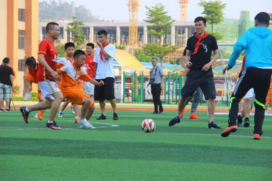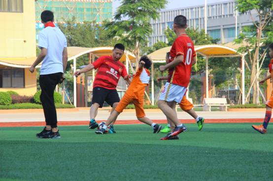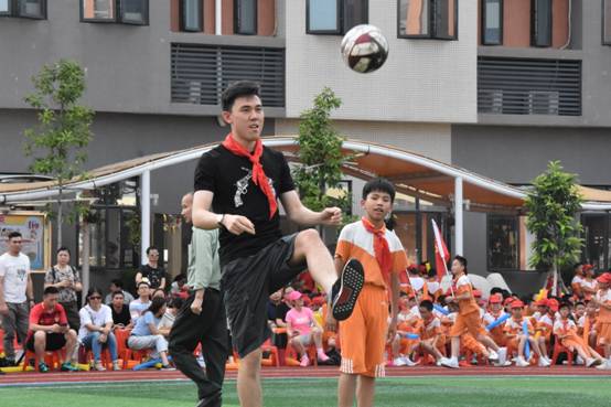 10分钟实训指导,10分钟两校区学生足球队对抗赛,10分种亲子混合赛继续将现场热情点燃。孩子们出色的表现不时赢得四位球星击掌、拥抱等方式的肯定和赞扬。