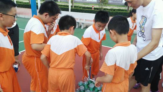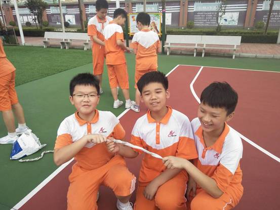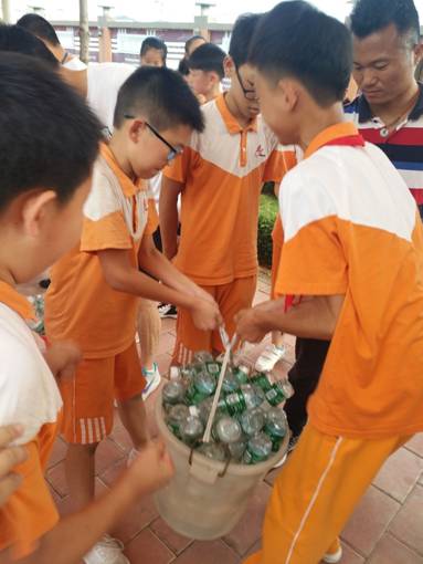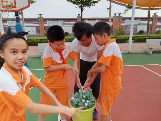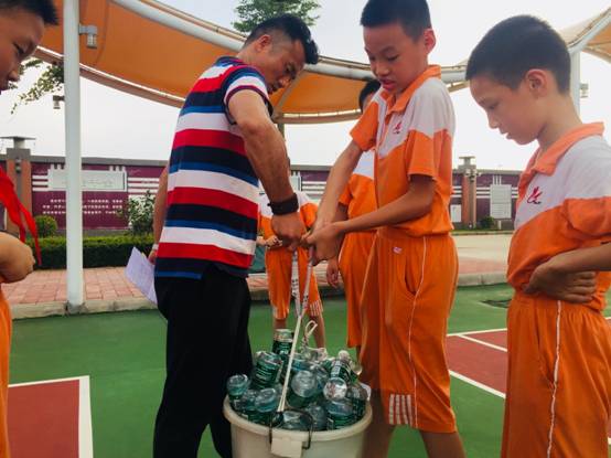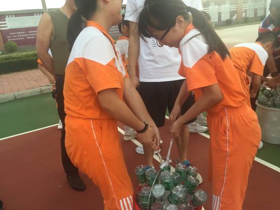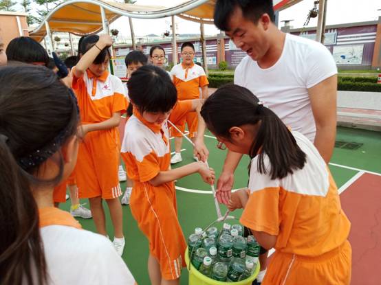 六(2)班上场时,两个孩子分别手握纸“绳”的两端,“绳”中间吊挂一个大桶,另一位屏气凝神,小心翼翼地往桶里一瓶一瓶地增加500g瓶装水,围观的同学大声数数……