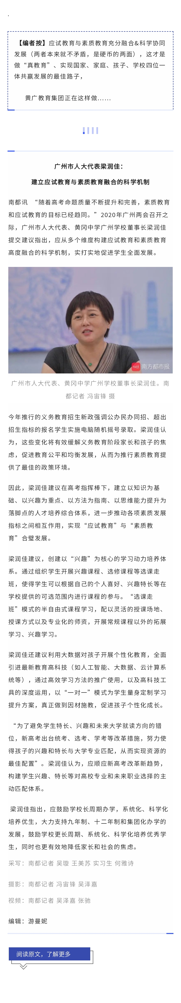 【南方都市报】广州市人大代表/黄广教育集团董事长梁润佳:建立应试教育与素质教育融合的科学机制培养优秀人才