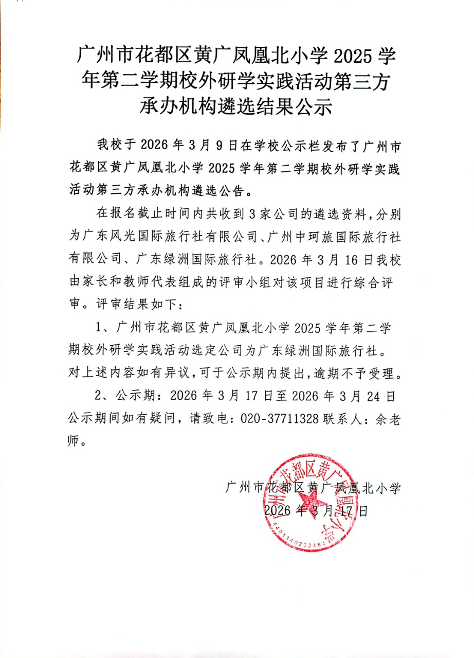 > 【公示】广州市花都区黄广凤凰北小学/黄广小学2026年春季研学公开询价项目评选结果公示