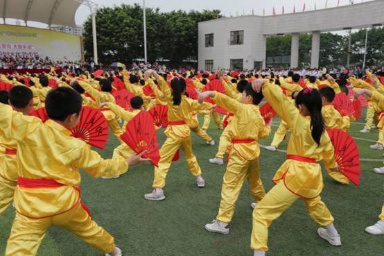随后,操场中央同时出现花样跳绳、戏剧花脸、武术套拳、国标舞蹈等串场表演,场上一排欢腾嬉戏。