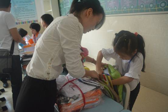 为了给孩子注册报到提供便捷服务,每班配备5名老师,每间宿舍安排了3名生活老师。教室外接待组有的采集信息,有的收集资料,有的开具缴费收据,有的在教室内接待学生,分发校服、书包。